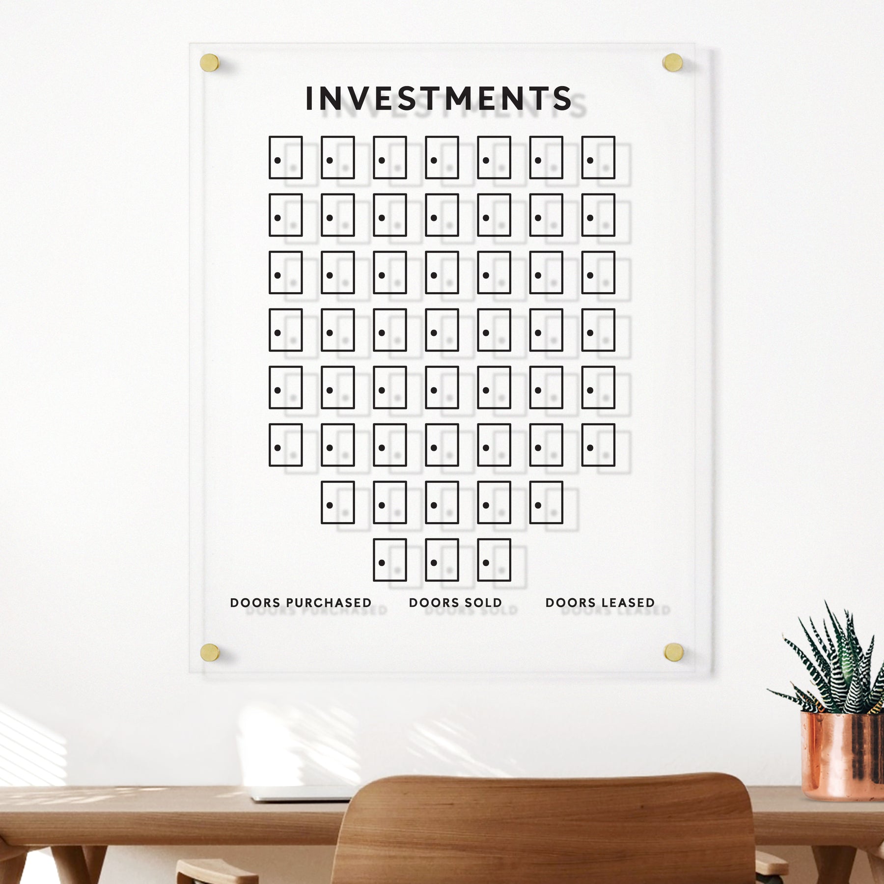 Close-up of the Girl Friday Goal Chart | Sales Tracker | Design Your Own Icon, a clear acrylic board on a white wall with gold standoff hardware. The sign features blurred black text, highlighting the corner design and mounting detail.