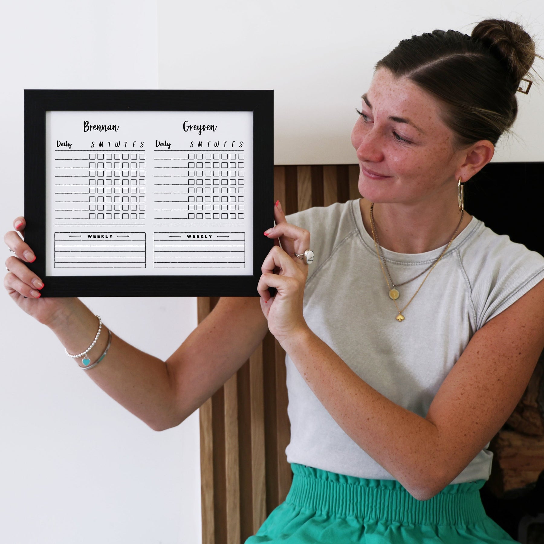 This beautiful framed personalized whiteboard chore chart is professionally designed, and is made to be used with dry erase markers, wet-erase markers, or chalk ink markers. The surface is an amazing premium acrylic. Markers erase completely from the acrylic surface.
