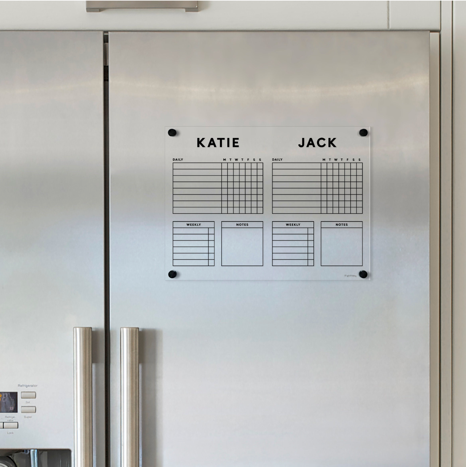 Acrylic Fridge Chore Chart for 2 children | Weekly and Notes | Block font | Black Text