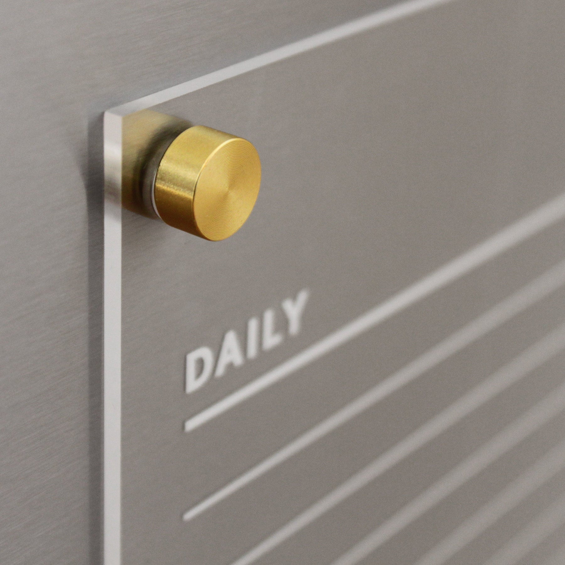 Close-up of a sleek wall-mounted planner board by Girl Friday with DAILY on it, featuring a black knob and inviting horizontal lines for wet-erase markers. This brushed metal piece offers a stylish take on the Acrylic Fridge Chore Chart for 2 children.