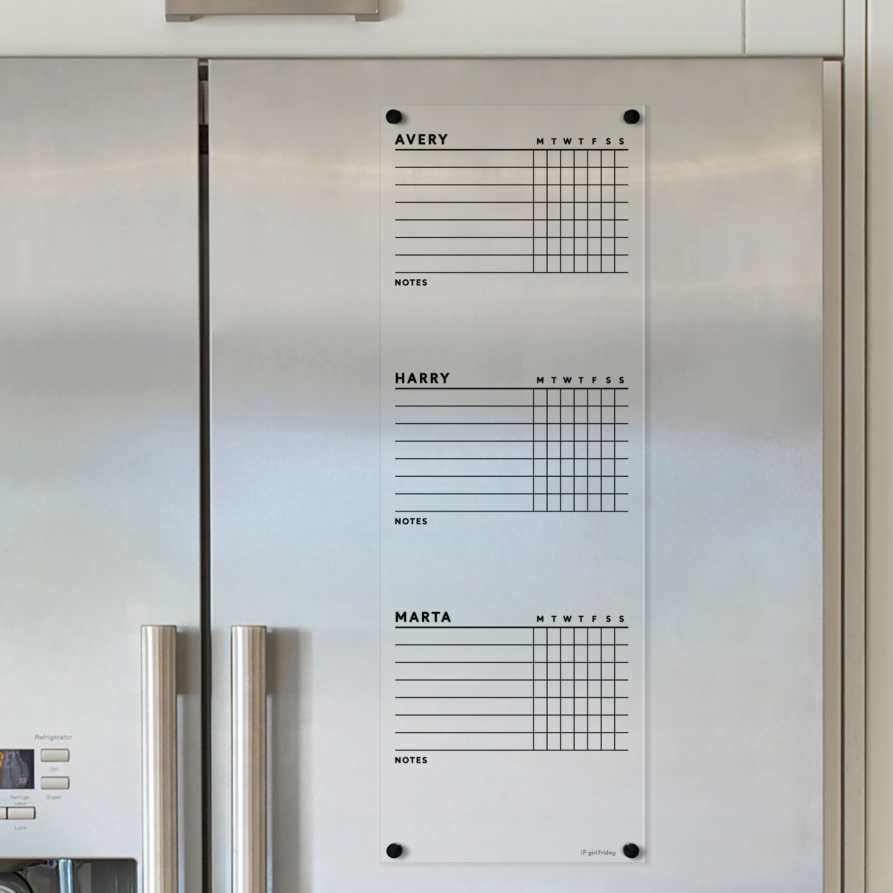 A Girl Friday Acrylic Fridge Chore Chart for up to five children is attached to the stainless steel fridge, featuring sections for Avery, Harry, and Marta with weekday and notes columns. Its compatible with wet-erase markers, perfectly complementing the fridges gleaming silver handles.
