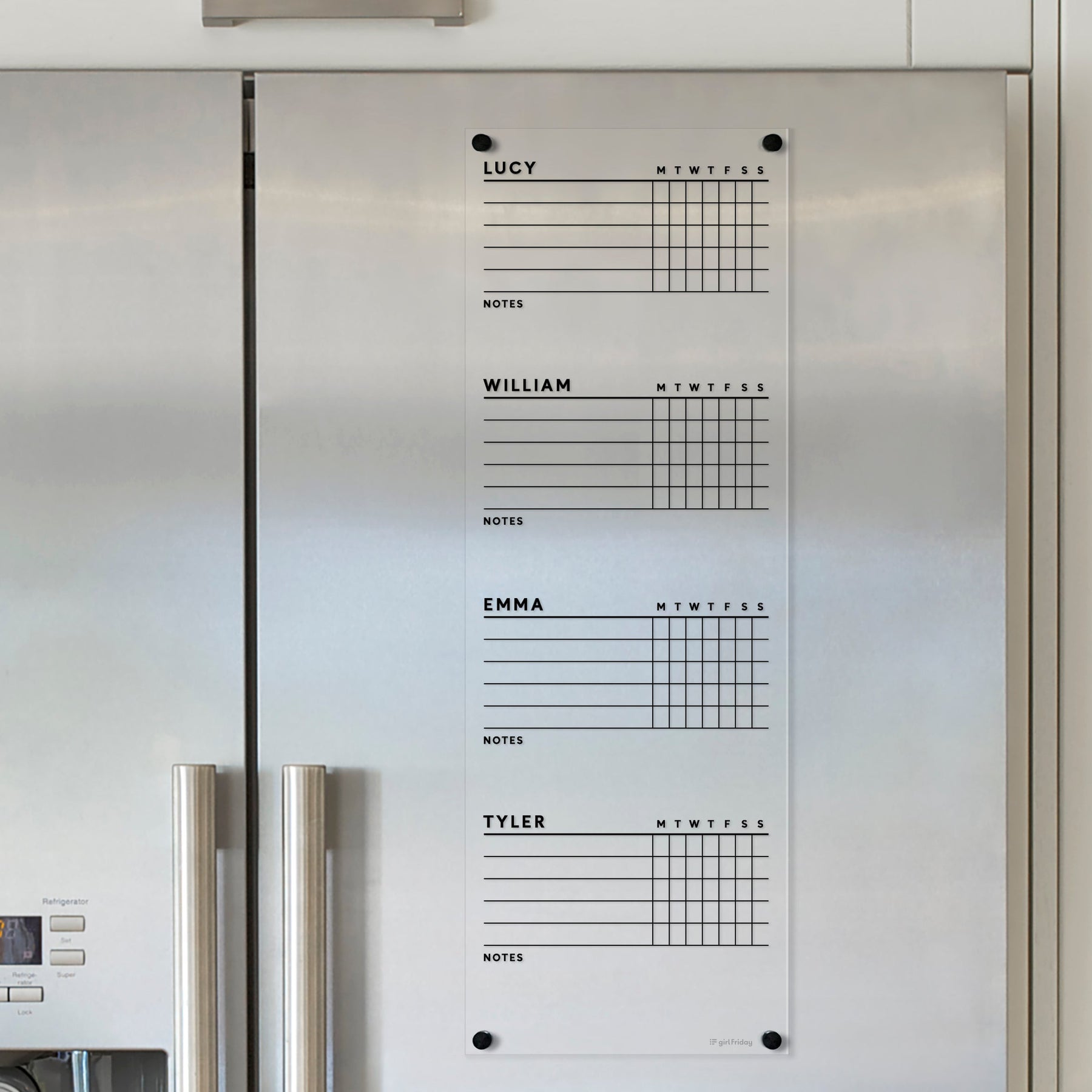 The Girl Friday Acrylic Fridge Chore Chart for 3-5 children features a sleek wall-mounted weekly planner with spaces for four names (Lucy, William, Emma, Tyler), days (MTWTFSS), and notes. Designed in black on white, its perfect for wet-erase markers.