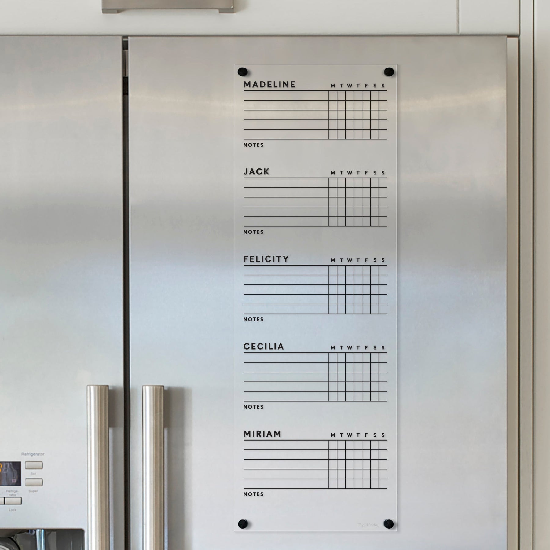 A Girl Friday Acrylic Fridge Chore Chart for 5 children is displayed on a stainless steel refrigerator. It includes sections for Madeline, Jack, Felicity, Cecilia, and Miriam with lines for notes and columns labeled M-S. Use wet-erase markers to keep tasks organized.