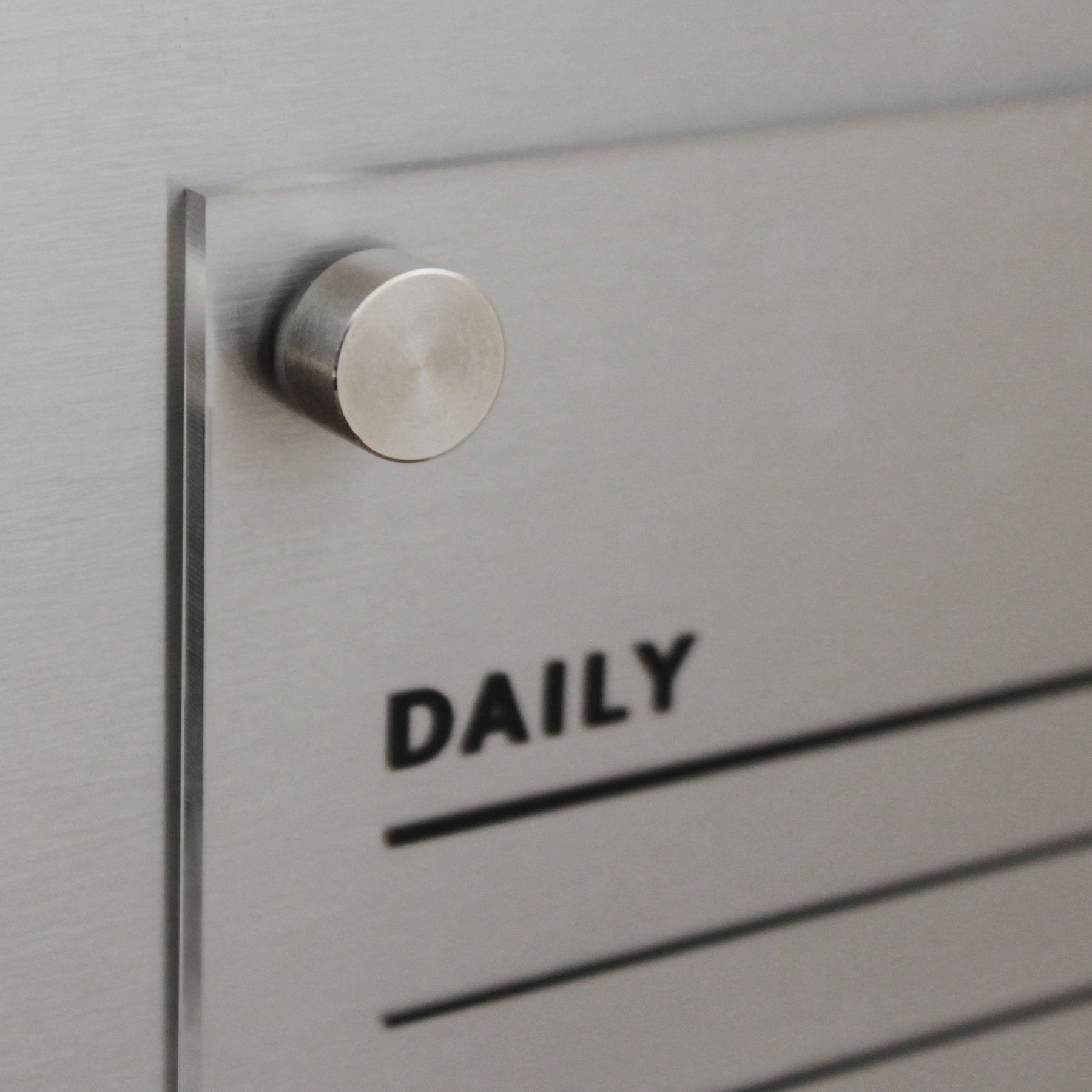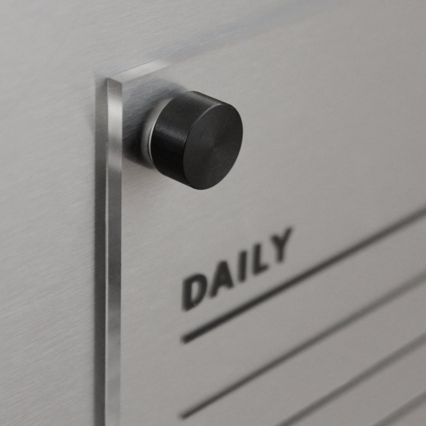 Close-up of a metallic planner board labeled DAILY with blank lines and a round metal knob, ideal for wet-erase markers. The brushed metal adds sleekness to this versatile Acrylic Fridge Chore Chart by Girl Friday, suitable for families with 3 to 5 children.