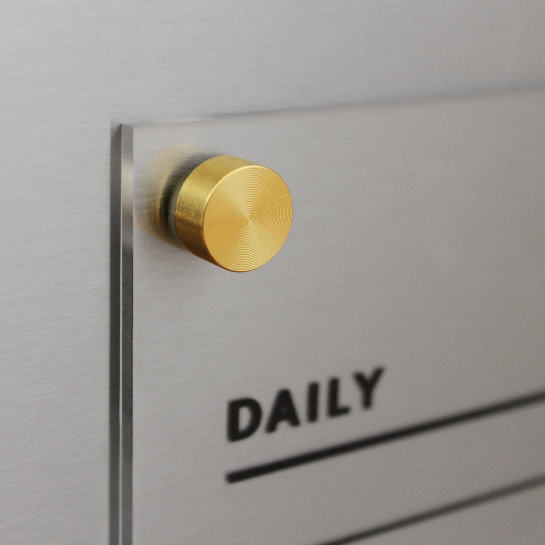 Close-up of a brass-colored knob on a transparent Girl Friday Acrylic Fridge Chore Chart for 3, 4, or 5 children. It is mounted on a metallic surface and shows DAILY in bold black letters with space below for wet-erase notes or lists.