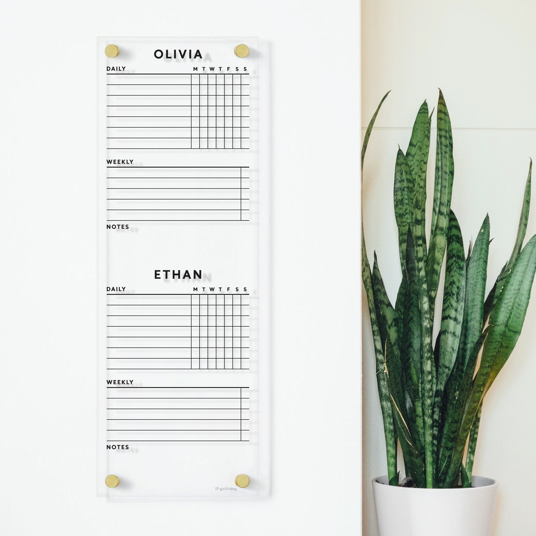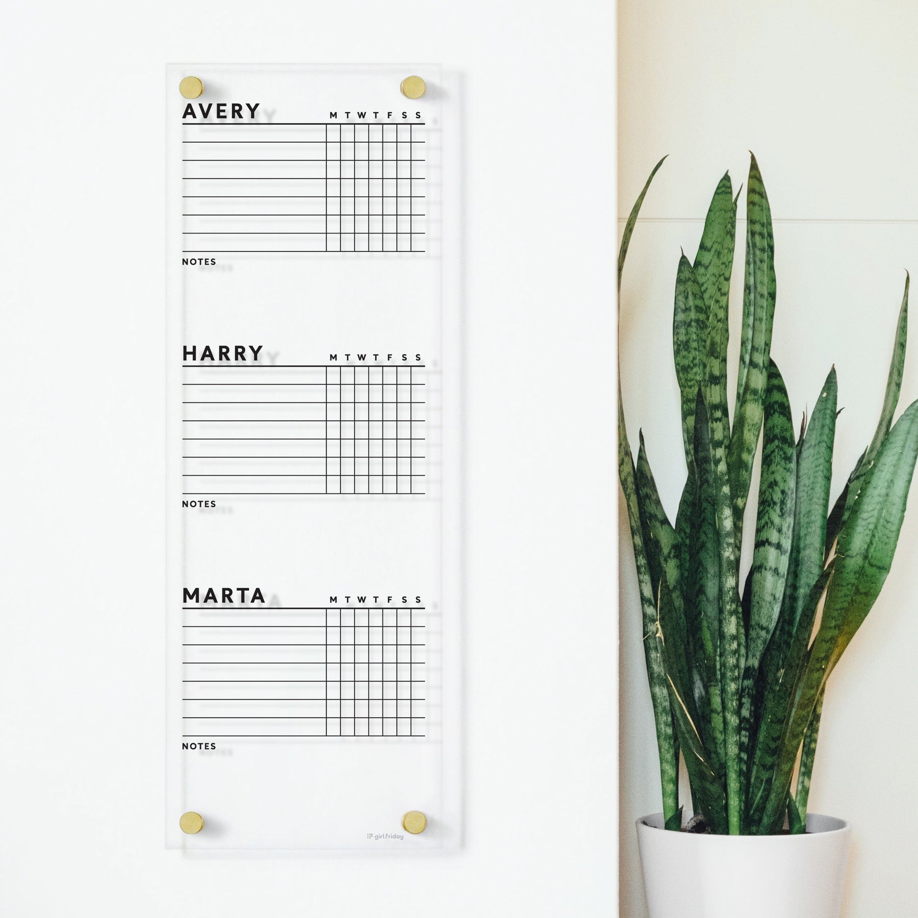 A white wall displays a vertical Clear Acrylic Customizable Chore Chart by Girl Friday, featuring sections for Avery, Harry, and Marta with day columns and note spaces, secured by gold knobs. A tall snake plant stands nearby.