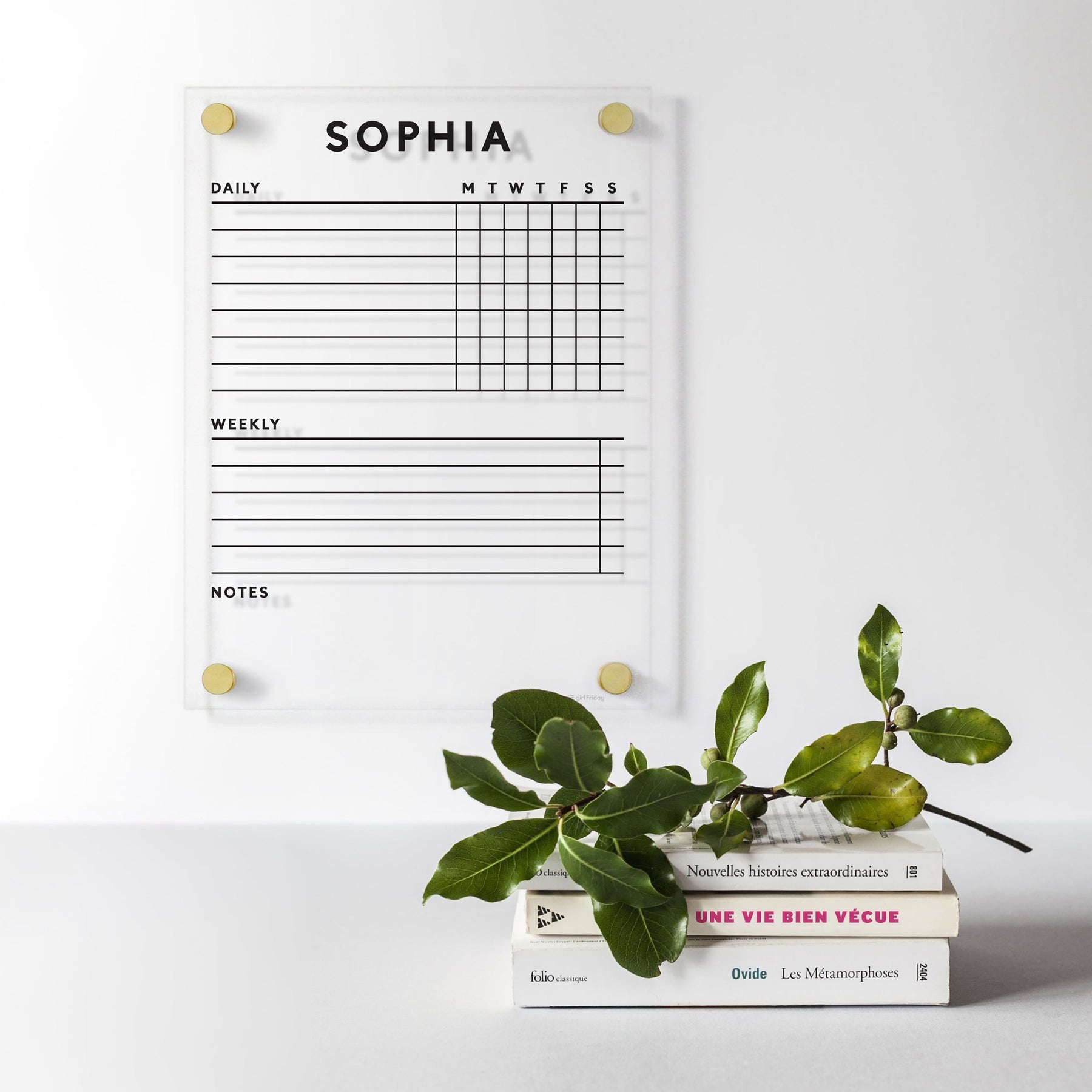 A Clear Acrylic Customizable Chore Chart by Girl Friday is mounted on the wall under the name Sophia, with sections for daily tasks, weekly tasks, and notes. Designed for wet-erase markers. Below, three stacked books hold a green plant branch.