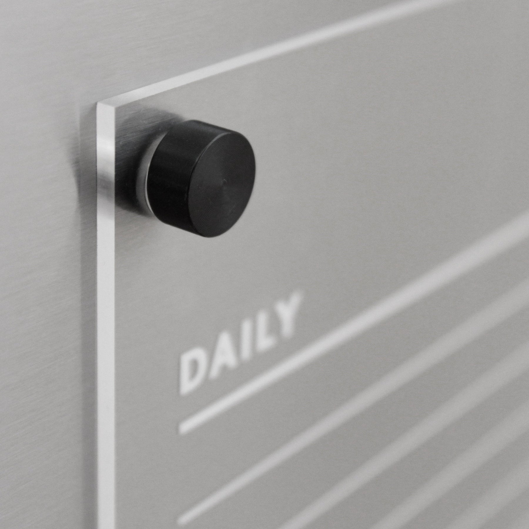 Close-up of a sleek wall-mounted planner board by Girl Friday with DAILY on it, featuring a black knob and inviting horizontal lines for wet-erase markers. This brushed metal piece offers a stylish take on the Acrylic Fridge Chore Chart for 2 children.