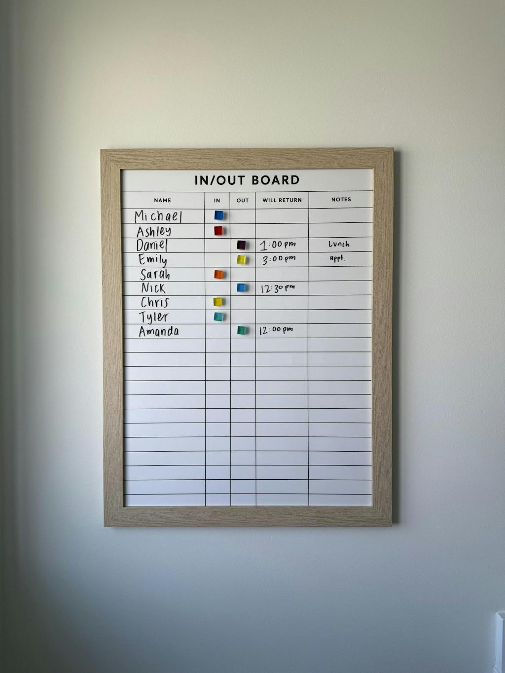 Let everyone see who is in and out with our high-quality, Framed Magnetic In and Out chart. Watch our video here